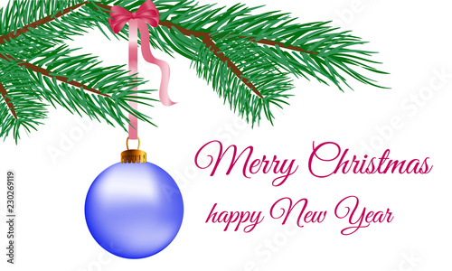 Merry Christmas happy new year text, greeting card design with Vector realistic blue christmas ball with fir branch and decorative ribbon isolated on white background. Glossy, shiny, glass bauble