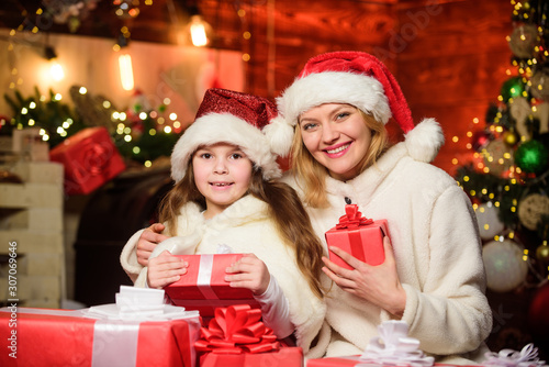 merry christmas. mother and daughter love holidays. xmas gift boxes. Open present. small child girl with mom in santa hat. Winter shopping sales. Happy family celebrate new year