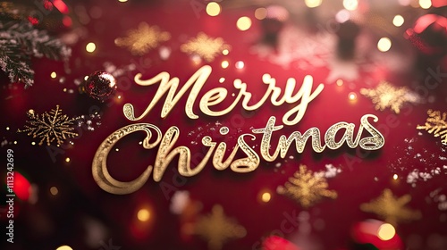 Merry Christmas presented in elegant gold script on a rich red background, surrounded by delicate snowflakes and twinkling lights.