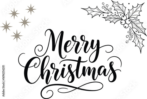 Merry Christmas Script, Holly, Stars on White Background, Elegant Style