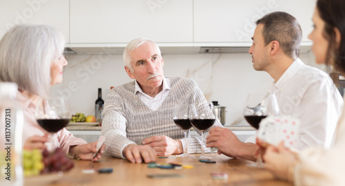 Merry old man and woman and young couple engaged in poker while having red wine in comfort of their house