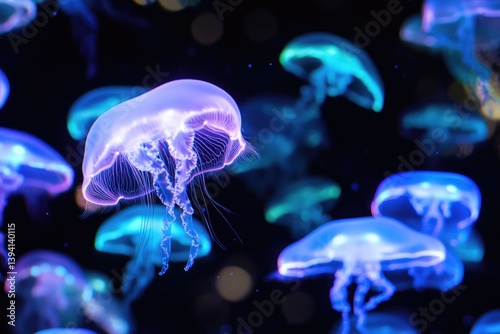 jellyfish, ocean, sea, underwater, marine life, aquatic, wildlife, nature, jelly, medusa, glowing, dark, blue, purple, pink, marine animal, bioluminescence, deep sea, oceanography, underwater photography, beautiful, mesmerizing, illuminated, dark background, vibrant, colourful