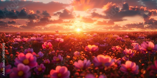 Mesmerizing sunset over a cosmos flower field, highlighting the vibrant colors and tranquil beauty of nature