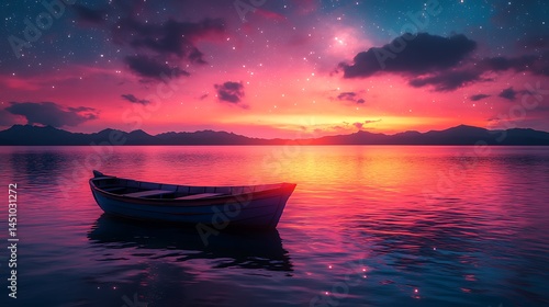 sunset, lake, boat, water, sky, star, twilight, horizon, calm, peaceful, mountain, dreamy, vibrant, pink, orange, scenic, landscape, night, glowing, tranquil, serene, cosmos, sea, sun, ocean, beach, sunrise, travel, nature, cloud, summer, silhouette, fishing, red, ship, evening, dusk, cloud, island