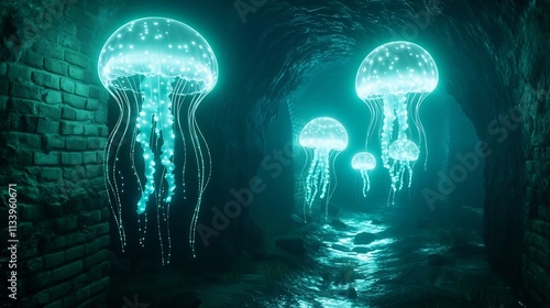 glow, light, underwater, cave, map, jellyfish, water, pathway, oceanic, cartography, radiant, aquatic, organism, aquamarine, atmosphere, photo, expedition, ocean, fantasy, aethereal, cinematic, meticulous, captivating, wonderfully, icon, pathway, organism