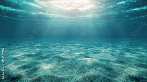 Mesmerizing Underwater Scene with Radiant Sunbeams Illuminating Soft Sandy Bottom Surrounded by Tranquil Blue Waters Creating a Serene Atmosphere