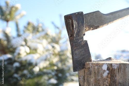 Metal axe in wooden log outdoors on sunny winter day, closeup. Space for text
