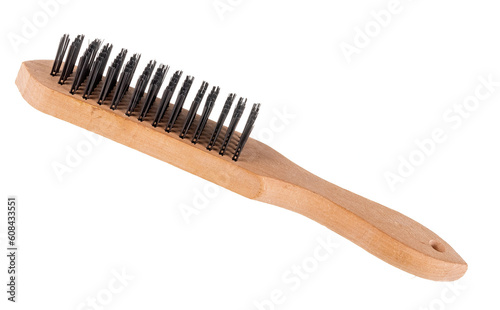 metal brush for cleaning metal with a plastic and wooden handle on a white background