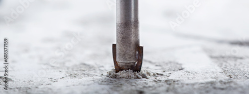 metal drill bit make holes in concrete wall with industrial drill. Building work industry.