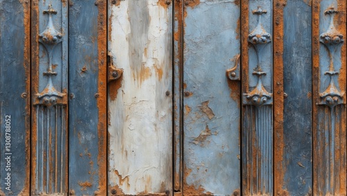 Metal gate with blue and white weathered paint. Decorative rusty ironwork with vertical panels and rivets. Old texture of aged surface.