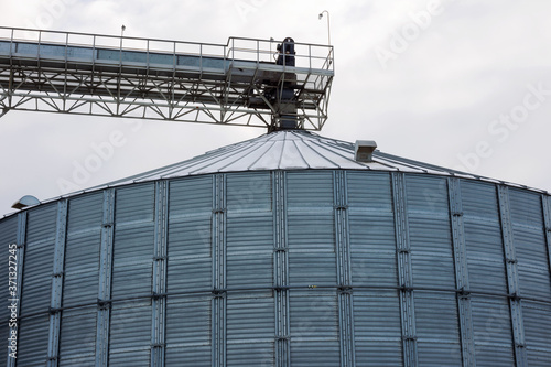 Metal grain elevator in agricultural zone. Agricultural Silos. Building Exterior. Storage and drying of grains, wheat, corn, soy, sunflower on background of cloudy sky. Agriculture.