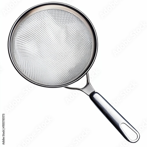 strainer, metal, kitchen, utensil, sieve, cooking, tool, mesh, fine, stainless, steel, handle, round, bowl, circular, food, preparation, filtering, draining, sifting, equipment, contraption, appliance, accessory, design, clean, shiny, simple, elegant, practical