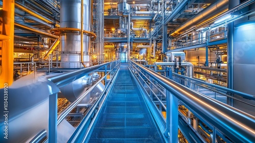 Metal walkways and piping systems create a dynamic environment in a chemical facility