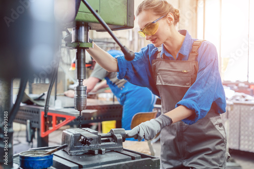 Metal worker woman operating drilling machine