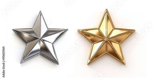 Metallic star shape bundle in silver and gold as design element, isolated on white background