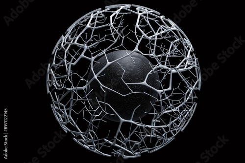 Metallic Tendrils: A dark sphere encased in a web of intricate, silver branches, isolated on black.