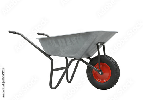 Metallic wheelbarrow black frame red wheel isolated on transparent background