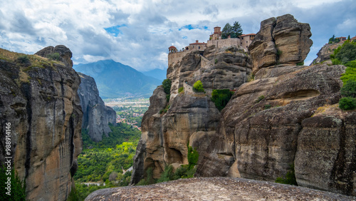 greece, meteor, monastery, mountain, view, panorama, aerial, high, rock, greek, religion, orthodox, mountain, cliff, landscape, landmark, rock, scenery, scenic, summer, tour tourism, travel, architecture, religious, sacred, spiritual, aerial view, unesco, church, holy, iconic, beautiful, cultural, christian, calmness, famous, magical, ancient, tranquil, majestic, impressive, serene, enchanting