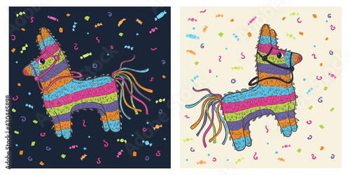 mexican party decorations with pinata, sweets, candies gift invitation card template