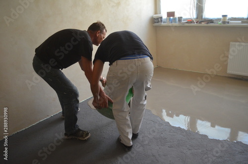Mężczyźni wylewający masę wylewki samopoziomującej na posadzkę