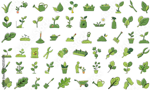 Micro greenery plant leafs and gardening tools icon set in hand drawn style for modern agricultural practices, promoting eco-friendly growth and sustainable development values