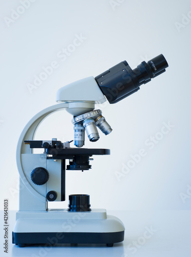 science, research, microscope, single object, studio shot, vertical, half face, no people, white background, one object, nobody