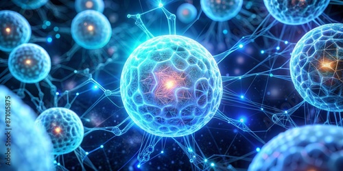 Microscopic view of a cyan-colored cell illuminated by luminescent lights