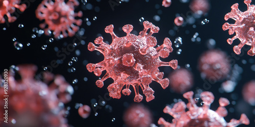 Microscopic view of a spreading virus, possibly a coronavirus or monkeypox, with spikes. 3D banner illustration, microscopic view of floating influenza virus cells. Corona virus SARS-CoV-2