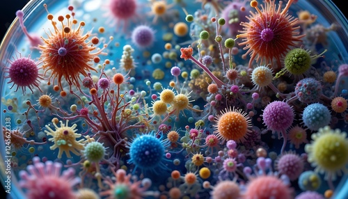 Microscopic view of colorful viruses and bacteria in a petri dish, a detailed illustration of infectious agents.