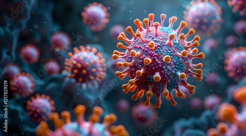 Microscopic view of virus cell structure in vibrant pink and orange colors against dark blue background, perfect for medical and scientific presentations.