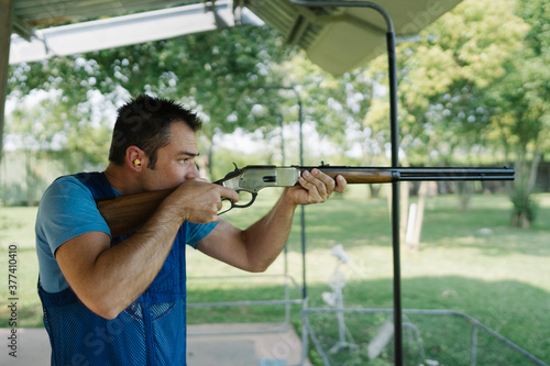 Mid Adult Man Training His Aim and Concentration Using a Shotgun in a Clay Pigeon Shooting Field Sport Centre