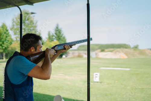 weapon, fire, training, file, train, eye, target, exercise, summer, danger, spring, court, sport, confidence, smoke, concentration, shotgun, clay, shot, center, set, cartridge, safety, bullet, round, blue, rifle, athlete, reload, munition, reflex, munition, refine, alone, recoil, aim, ready, adult, projectile, precision, point, detail, 1, mag, loaded, hold, gun, green, open space, gaze, copy space, unusual, caucasian, white, man, male, person, people, adult, 30s, grown-up
