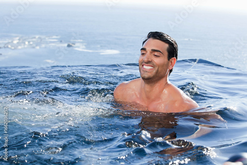 man, shirtless, sea, wave, sunlight, marin, wellness, vitality, calmness, copy space, adventure, swimming, water, horizon, smiling, muscular, clear sky, sunny, dark hair, leisure, deep blue, ocean, natural, bright, peaceful, fresh, relaxing, healthy, water sport, summer, solitude, freedom, energizing, splash, calm, active, strength, enjoyment, health care, fitness, lifestyle, single, daylight