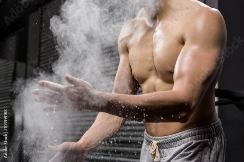 Mid section of shirtless man clapping hands with talc