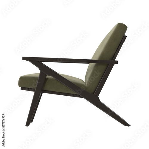 Mid-Century Modern Armchair, Wooden Frame and Olive Green Fabric, Side View 3D Render