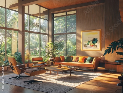 Mid-Century Modern Living Room Interior Design with Large Windows and Sunlight Streaming In.
