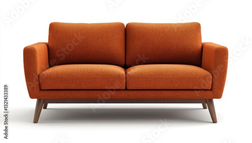 Mid-century modern orange couch. A comfortable two-seater sofa with a simple design. Orange fabric upholstery and light brown wooden legs