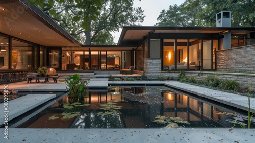 mid-century modern suburban house with a minimalist pond that reflects the homea??s clean lines and tranquil setting