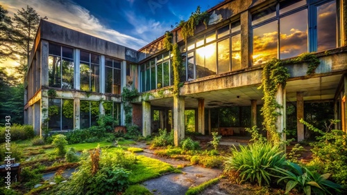 decay, ruin, overgrown, vegetation, concrete, steel, glasses, window, door, texture, light, shadow, moody, atmospheric, cinematic, photo, photorealistic, detail, building, structure, retro, vintage, industrial, forgotten, neglected, exploration, discovery, urban, city, derelict, remnant, past, history, time, decayed, crumbling, aged, weathered, graffiti, rust, metal