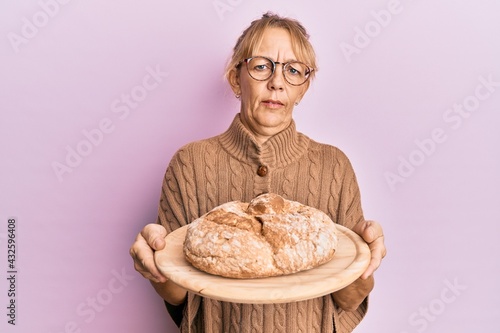 Middle age blonde woman holding bread clueless and confused expression. doubt concept.