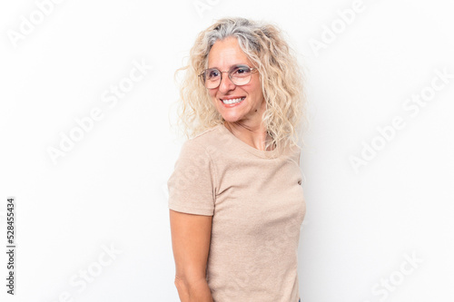 Middle age caucasian woman isolated on white background looks aside smiling, cheerful and pleasant.