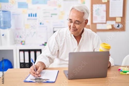 Middle age grey-haired man business worker using laptop writing on document at office