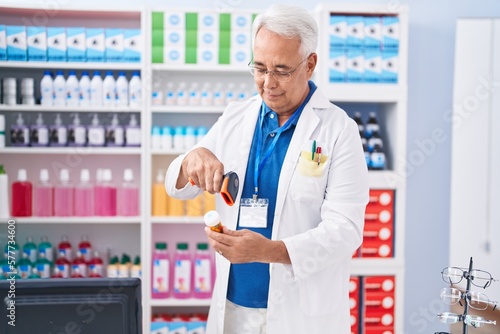 Middle age grey-haired man pharmacist scanning pills bottle at pharmacy
