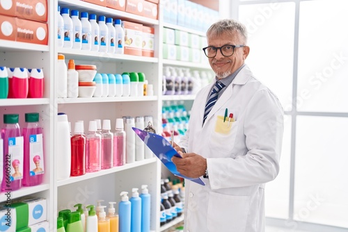 Middle age grey-haired man pharmacist writing on document at laboratory