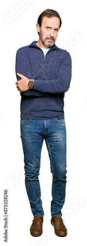 Middle age handsome man wearing a sweater skeptic and nervous, disapproving expression on face with crossed arms. Negative person.