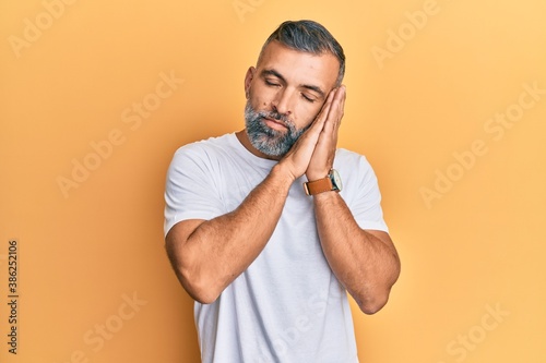 Middle age handsome man wearing casual white tshirt sleeping tired dreaming and posing with hands together while smiling with closed eyes.