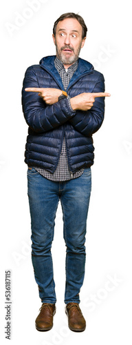 Middle age handsome man wearing winter coat Pointing to both sides with fingers, different direction disagree