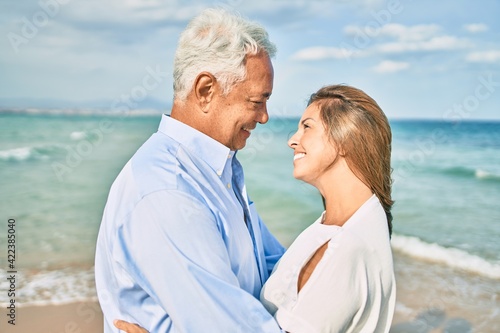 Middle age hispanic couple smiling happy and hugging walking at the beach
