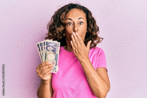 Middle age hispanic woman holding japanese yen banknotes covering mouth with hand, shocked and afraid for mistake. surprised expression