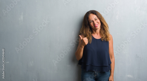 Middle age hispanic woman standing over grey grunge wall doing happy thumbs up gesture with hand. Approving expression looking at the camera with showing success.